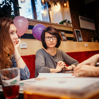 Далее Алла Чугуева и молодые специалисты студии провели несколько развлекательных игр для компании, помогающих развить социальный интеллект и улучшить работу мозга. Кафе тряслось от смеха, но ни один бармен и шарик не пострадал. Люди с интересом узнали о том, что развивается рынок психологических настольных игр, и вечеринку в компании можно провести не только весело, но и с пользой для интеллекта. А тем, у кого есть дети - открылся новый способ коммуникации с ними.